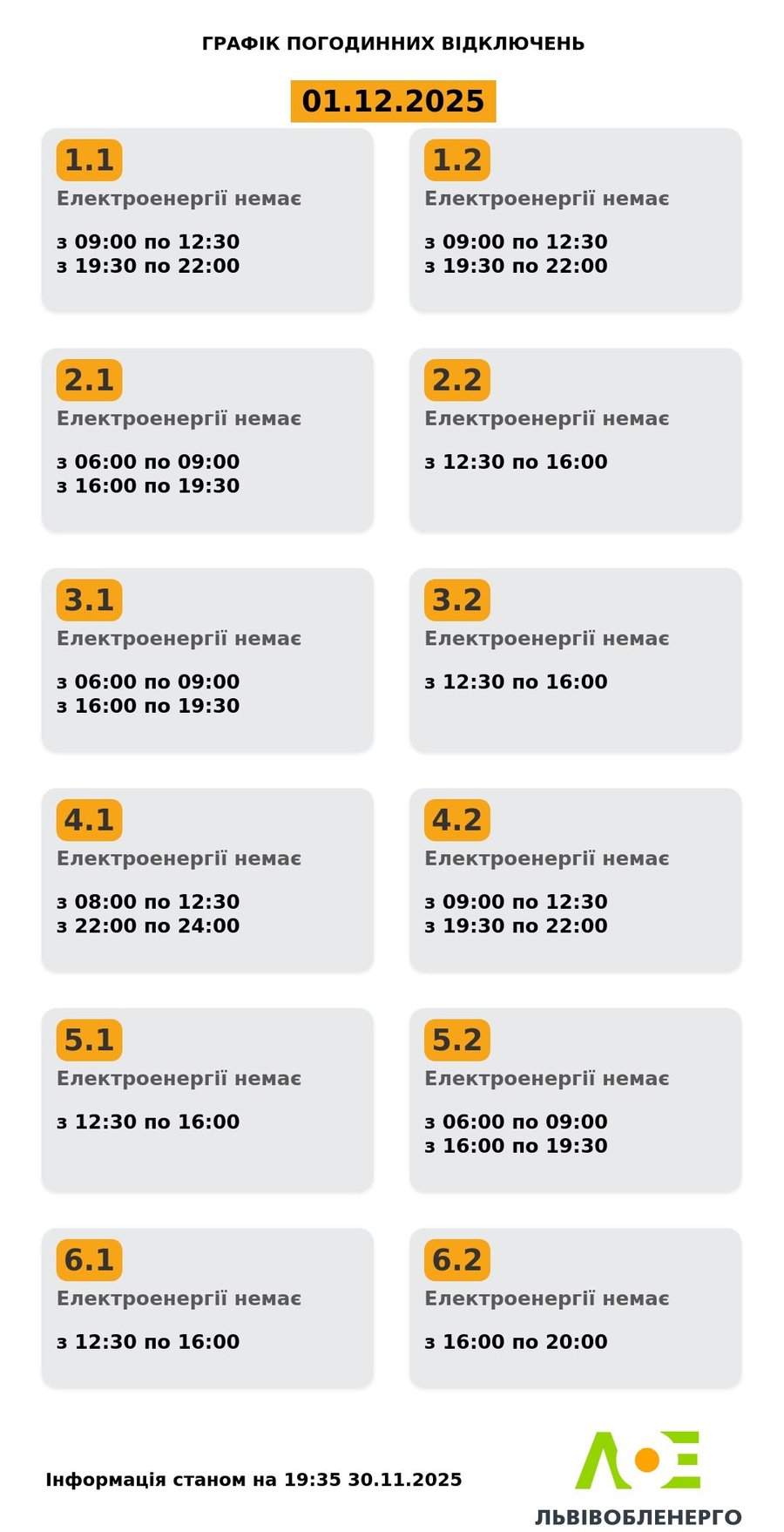 За даними компанії, відключення діятимуть протягом доби відповідно до груп споживачів. Нижче наведено актуальні інтервали вимкнень станом на 1 грудня.