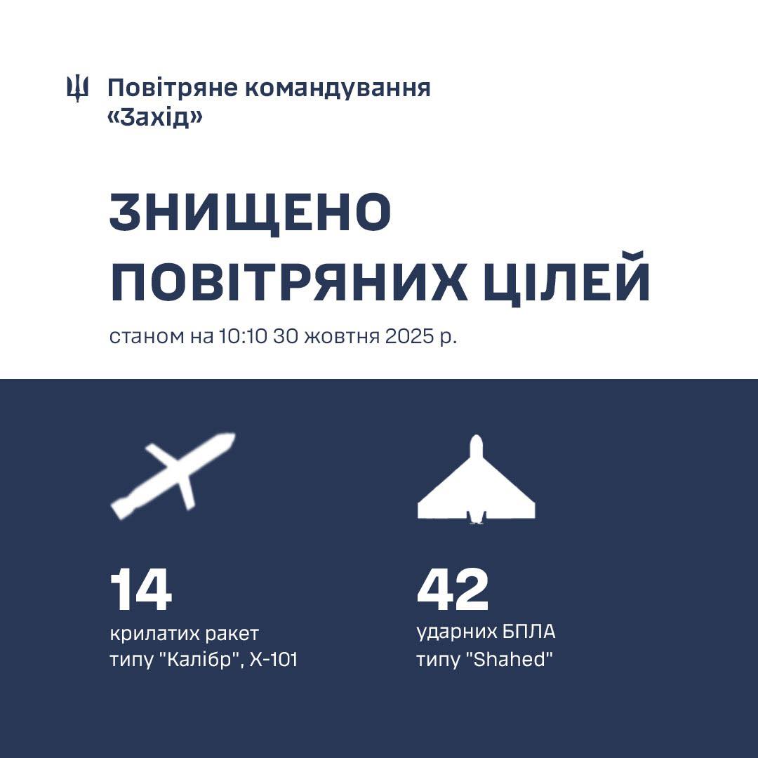 “Підрозділи протиповітряної оборони та авіація повітряного командування «Захід» в зоні своєї відповідальності знищили 14 крилатих ракет та 42 ударних БпЛА типу «Shahed»”, – йдеться у повідомленні.