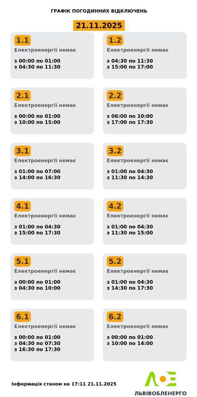 У “Львівобленерго” оновили графіки погодинних відключень електроенергії на сьогодні, 21 листопада. Про це повідомили на сторінці компанії.