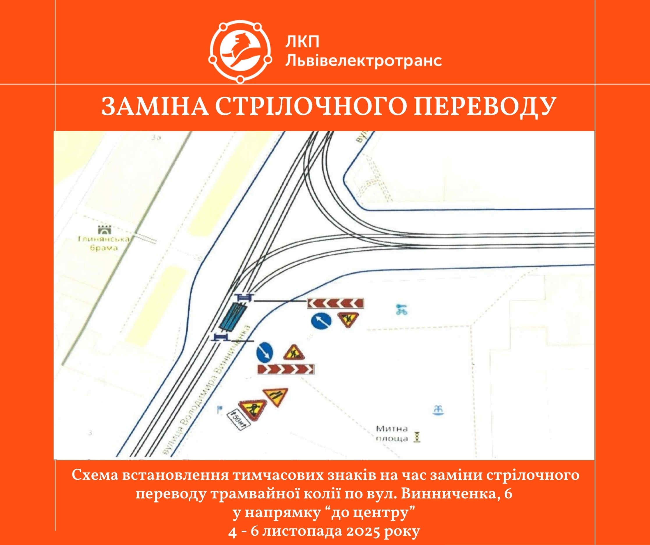 Уночі з 4 на 5 листопада на вулиці Винниченка у Львові розпочнуть заміну стрілочного переводу трамвайної колії, через що можливе тимчасове сповільнення руху транспорту. Про це повідомили в ЛКП «Львівелектротранс».