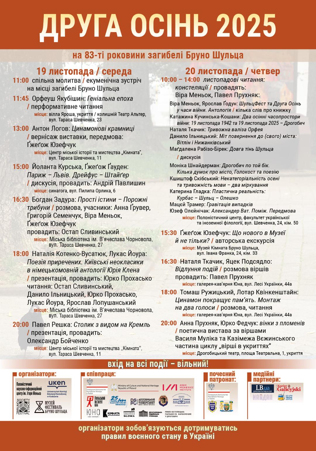 Дводенний цикл подій Другої Осені традиційно розпочнеться екуменічною зустріччю й спільною молитвою в інтенції Бруно Шульца та тих, хто присвятився збереженню пам’яті про нього та про історичну багатокультурність Дрогобича. 19 листопада об 11:00 запрошуємо долучитися до спільної молитви на місці загибелі Бруно Шульца та на Алеї Пам’яті – за загиблих захисників і захисниць України та за всіх невинних жертв, закатованих й убитих російським терором.