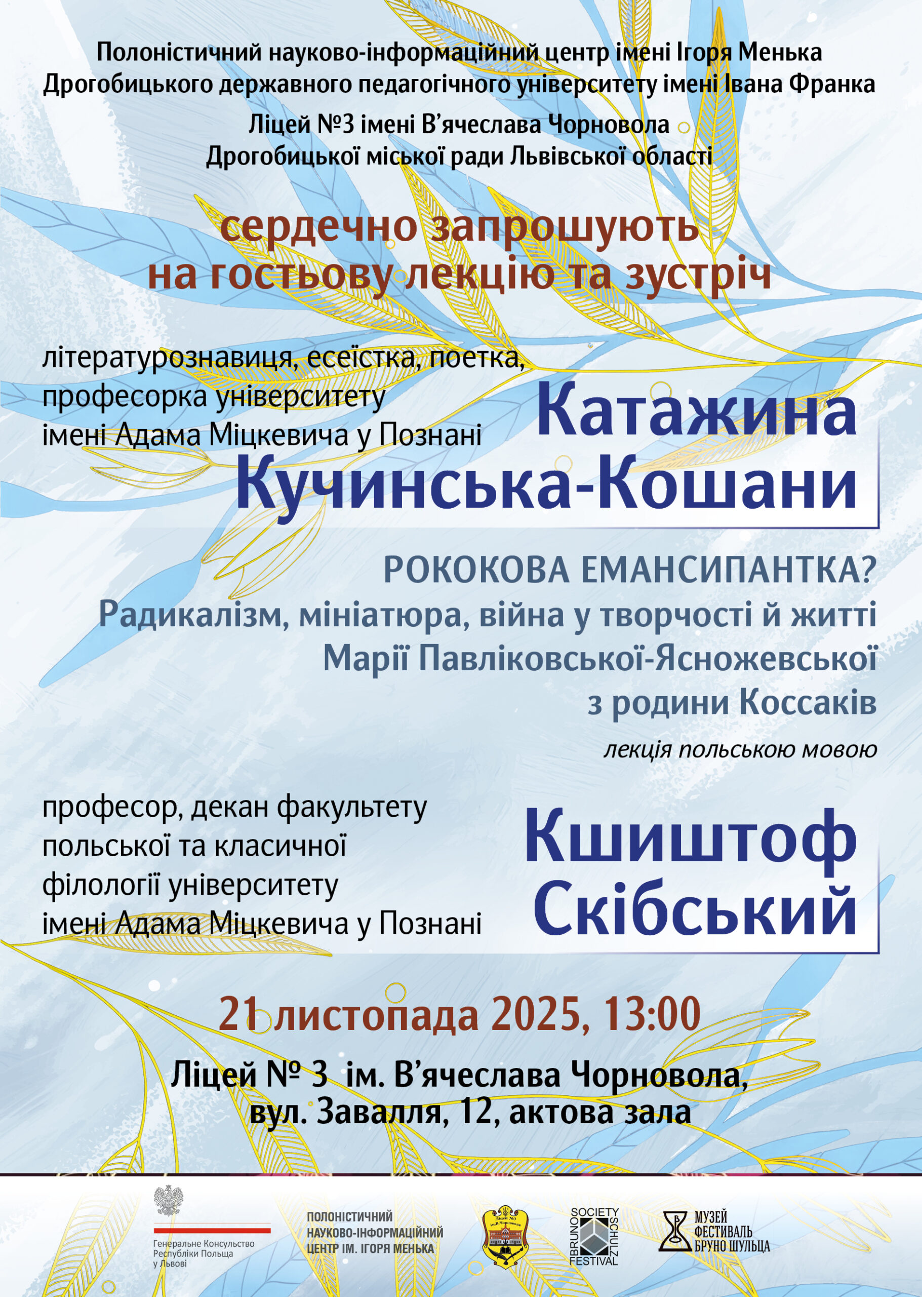 Отже, 21 листопада о 13:00 в актовій залі Ліцею № 3 відбудеться лекція Катажини Кучинської-Кошани про мало знану в Україні чудову польську поетку минулого сторіччя Марію Павліковську-Ясножевську, творчість якої не оминули теми війни. По завершенні лекції відбудеться зустріч і розмова з Кшиштофом Скібським.