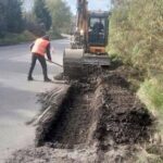 На узбіччі дороги працює невеликий екскаватор, а робітник у жилеті займається земляними роботами для облаштування тротуару. Окрім нового покриття, тут буде встановлено зупинку громадського транспорту та пішохідні переходи.