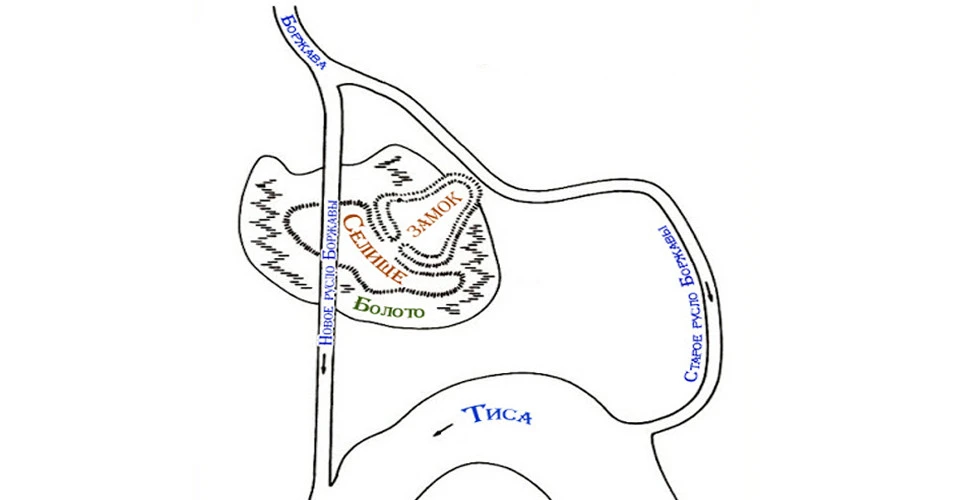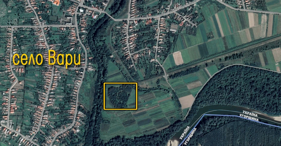 фото: супутниковий знімок Замок, імовірно, був побудований на місці Боржавського городища IX ст. Тоді це городище називалося castrum borsoa, тобто “Фортеця Боршо”, або “Фортеця Боржава”. Фортеця згадується в найдавнішому угорському літописі Gesta Hungarorum невідомого автора, якого називають Анонім, чи Анонімус. Відомо, що він, імовірно, був нотарем угорського короля Бейли III (1172–1196). Появу самого документа науковці датують другою половиною ХІІ століття.У 14-й главі літопису городище вказане у зв’язку з проникненням угорців у регіон Верхнього Потисся. У 903 році (за іншими даними – у 896-му), як писав той самий Анонім, Боржавське городище взяли в облогу кочівники-угри та після триденної облоги захопили. Хроніка про ці події оповідає так:”У 903 році після Різдва Христового, вождь Арпад, пославши свої війська, весь край, який лежить між Тисою і Бодрогом, аж до Угочі собі підпорядкував і фортецею Боржоа оточив, а на третій день приступом узяв, стіни зруйнував, а воїнів Салана в кайданах повів до фортеці Гунг”.Гунг – це Ужгород, який, згідно з літописом, угорці захопили перед узяттям Боржавського замку, коли вбили князя Лаборця біля річки Свіржава (нині річка Лаборець у Словаччині). Царя Салана співвідносять із болгарським царем Симеоном I Великим (864 або 865–927), а землі поблизу нинішнього села Вари до приходу угорців, за версією Аноніма, перебували під контролем Болгарського царства (як і Ужгород та Мукачево).У IX столітті землі в районі нинішнього села Вари перебували під контролем Болгарського царства, про що писав Анонім. А перша достовірна письмова згадка про замок датується 1320 роком.В XІ-XІІ ст. угорські королі відновили форпост на Тисі на місці зруйнованого городища. Побудовані оборонні королівські споруди з каменю відігравали роль прикордонного укріплення. 1214 року в цій місцевості створили комітат Боршоа, центром якого й був Боржавський замок.У 1964 році археологи обстежили замчище. Під час досліджень з’ясували, що рови укріплення були викладені обпаленою глиною і датовані X-XІ. Пізніше, у 2005-2006 роках, це підтвердили у своїх дослідженнях співробітники Інституту карпатознавства Ужгородського національного університету.Розташування і план замкуЗалишки Боржавського городища розташовані за кілька сотень метрів від угорського кордону в трикутнику на місці злиття річок Боржава й Тиса.Таке розташування в клині, утвореному двома руслами, було добрим природним захистом. З півночі, сходу та півдня доступ до городища обмежували води річок, а із заходу та північного сходу поселення оберігали болота.