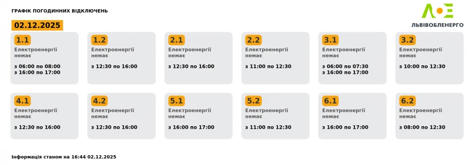 фото: ЛьвівобленергоІнформація станом на 16:44 02.12.2025Група 1.1. Електроенергії немає з 06:00 до 08:00, з 16:00 до 17:00.Група 1.2. Електроенергії немає з 12:30 до 16:00.Група 2.1. Електроенергії немає з 12:30 до 16:00.Група 2.2. Електроенергії немає з 11:00 до 12:30.Група 3.1. Електроенергії немає з 06:00 до 07:30, з 16:00 до 17:00.Група 3.2. Електроенергії немає з 10:00 до 12:30.Група 4.1. Електроенергії немає з 12:30 до 16:00.Група 4.2. Електроенергії немає з 12:30 до 16:00.Група 5.1. Електроенергії немає з 16:00 до 17:00.Група 5.2. Електроенергії немає з 11:00 до 12:30.Група 6.1. Електроенергії немає з 16:00 до 17:00.Група 6.2. Електроенергії немає з 08:00 до 12:30.