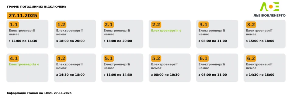 фото: ЛьвівобленергоГрафік погодинних відключень на 27.11.2025.Інформація станом на 10:21Група 1.1. Електроенергії немає з 11:00 до 14:30.Група 1.2. Електроенергії немає з 18:00 до 20:00.Група 2.1. Електроенергії немає з 18:00 до 20:00.Група 2.2. Електроенергія є.Група 3.1. Електроенергії немає з 08:00 до 11:00.Група 3.2. Електроенергії немає з 15:00 до 18:00.Група 4.1. Електроенергія є.Група 4.2. Електроенергії немає з 14:30 до 18:00.Група 5.1. Електроенергії немає з 11:00 до 14:30.Група 5.2. Електроенергії немає з 08:00 до 10:30.Група 6.1. Електроенергії немає з 08:00 до 11:00.Група 6.2. Електроенергії немає з 14:30 до 18:00.19 листопада окупанти атакували Львівщину бойовими безпілотниками та крилатими ракетами. Постраждав енергообʼєкт.