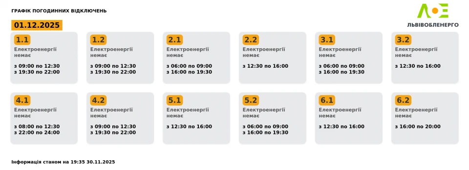 Про це повідомило Львівобленерго.Графік погодинних відключень на 1 грудняфото: ЛьвівобленергоІнформація станом на 19:35 30 листопадаГрупа 1.1. Електроенергії немає з 09:00 до 12:30, з 19:30 до 22:00.Група 1.2. Електроенергії немає з 09:00 до 12:30, з 19:30 до 22:00.Група 2.1. Електроенергії немає з 06:00 до 09:00, з 16:00 до 19:30.Група 2.2. Електроенергії немає з 12:30 до 16:00.Група 3.1. Електроенергії немає з 06:00 до 09:00, з 16:00 до 19:30.Група 3.2. Електроенергії немає з 12:30 до 16:00.Група 4.1. Електроенергії немає з 08:00 до 12:30, з 22:00 до 24:00.Група 4.2. Електроенергії немає з 09:00 до 12:30, з 19:30 до 22:00.Група 5.1. Електроенергії немає з 12:30 до 16:00.Група 5.2. Електроенергії немає з 06:00 до 09:00, з 16:00 до 19:30.Група 6.1. Електроенергії немає з 12:30 до 16:00.Група 6.2. Електроенергії немає з 16:00 до 20:00.