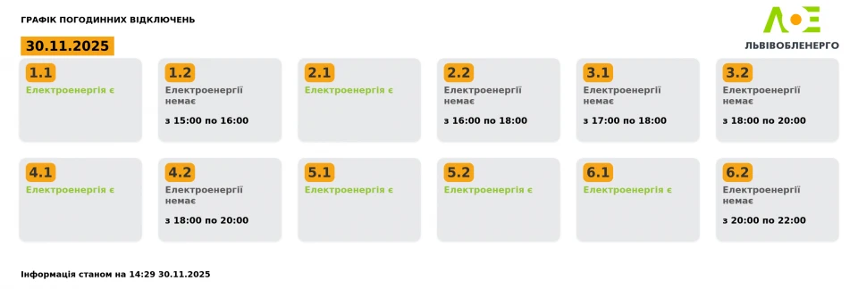 фото: ЛьвівобленергоГрафік погодинних відключень на 30 листопада. Інформація станом на 14:29Група 1.1. Електроенергія є.Група 1.2. Електроенергії немає з 15:00 до 16:00.Група 2.1. Електроенергія є.Група 2.2. Електроенергії немає з 16:00 до 18:00.Група 3.1. Електроенергії немає з 17:00 до 18:00.Група 3.2. Електроенергії немає з 18:00 до 20:00.Група 4.1. Електроенергія є.Група 4.2. Електроенергії немає з 18:00 до 20:00.Група 5.1. Електроенергія є.Група 5.2. Електроенергія є.Група 6.1. Електроенергія є.Група 6.2. Електроенергії немає з 20:00 до 22:00.