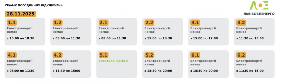Про це повідомили у Львівобленерго.Графік погодинних відключень на 28.11.2025 станом на 19:03 27.11.2025.