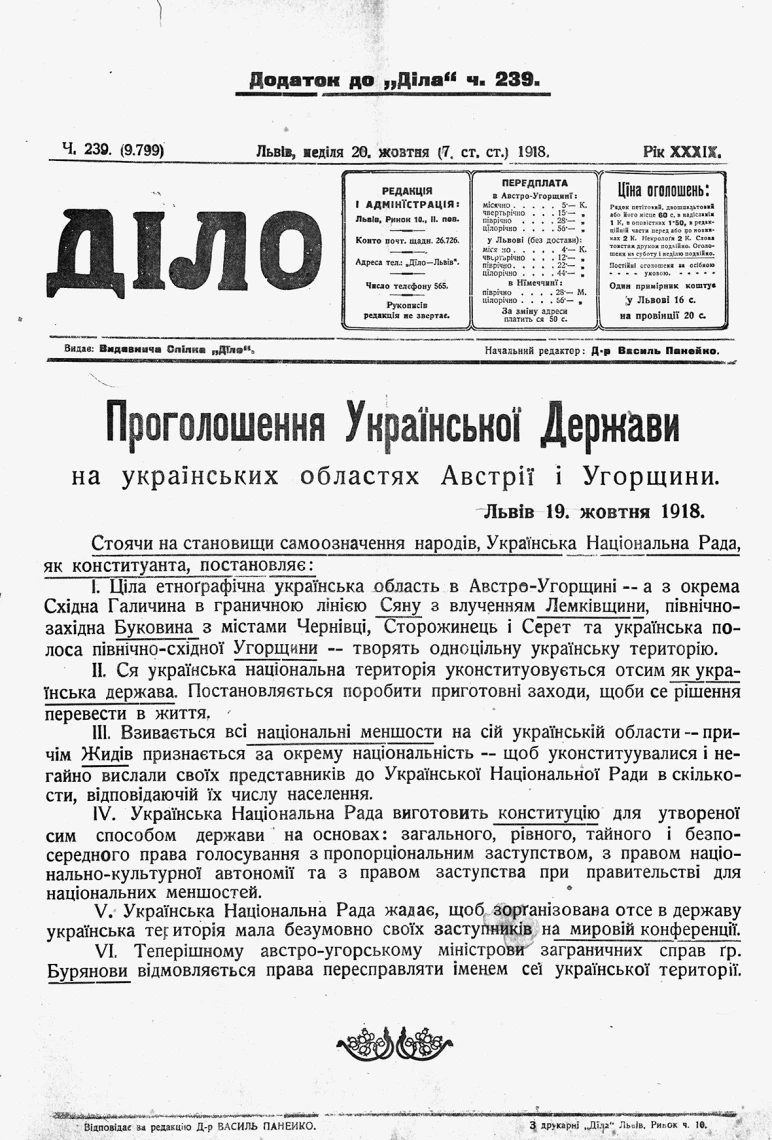 Додаток до “Діла” ч. 239. Львів, неділя 20. жовтня (7. ст. ст.) 1918, фото: zbruc.euТак 19 жовтня на політичній карті Європи постала нова держава — Західноукраїнська Народна Республіка (ЗУНР).Головою Української Національної Ради став Євген Петрушевич. Для ефективної роботи Рада створила три делегації: виконавчу — фактично тимчасовий уряд на чолі з Петрушевичем (у Відні); галицько-закарпатську — під керівництвом Костя Левицького (у Львові); буковинську — під головуванням Омеляна Поповича (у Чернівцях).20 жовтня у Львові, на площі святого Юра, відбулося народне віче, під час якого урочисто проголосили створення української держави на землях Австро-Угорщини.У ці дні Кракові поляки створили Польську ліквідаційну комісію, яка мала перебрати владу в Галичині від Австрії на користь Польщі.Про Євгена ПетрушевичаЄвген Петрушевич народився 3 червня 1863 року в місті Буськ на Львівщині. Юнак ріс у родині греко-католицького священника, а далекі предки Петрушевичів за часів Речі Посполитої були білоруськими шляхтичами.