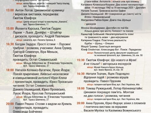 Щорічний Міжнародний літературно-мистецький проєкт, який 19–20 листопада вже у двадцять четверте відбудеться у Дрогобичі, також має назву Друга Осінь – як і оповідання Шульца і водночас як перспектива життя творчості й уяви, що долають смерть. Друга Осінь присвячена роковинам загибелі Бруно Шульца, ініційована Полоністичним науково-інформаційним центром імені Ігоря Менька Дрогобицького університету, організована спільно із Краківським […]