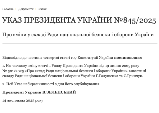 Глава держави підписав указ №845/2025. про зміни у складі Ради національної безпеки та оборони. Зі складу Ради національної безпеки та оборони виведено Світлану Гринчук та Германа Галущенка. Раніше вони подали у відставку з посад очільників Міненерго та Міністерства юстиції. Як відомо, НАБУ та САП викрили та задокументували діяльність злочинної організації, до складу якої входили чинні […]